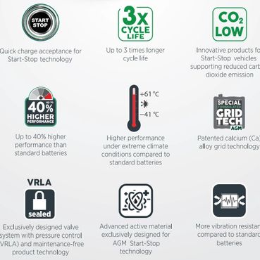 Castrol AGM Batteries are VRLA (Valve Regulated Lead Acid) batteries that utilise AGM (Absorbent Glass Mat) technology. They are ideal for vehicles equipped with advanced Start-Stop systems with regenerative braking capabilities.