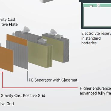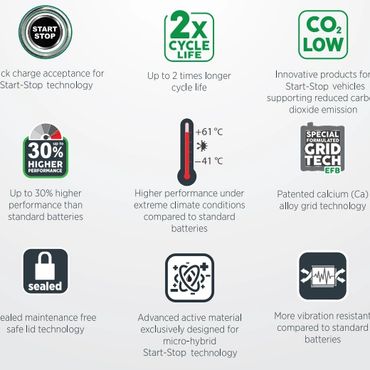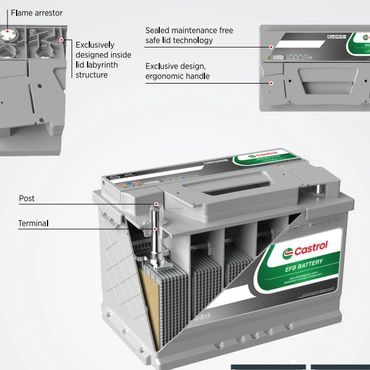 Suitable for use under varying climate conditions and different temperatures, Castrol EFB Batteries deliver up to 30% higher performance than standard batteries and a cycle life up to twice as long as that of the standard ones. The maintenance-free product technology, increased electrolyte reserve and the fully sealed, leakproof cover system provide both safety and long service life. Castrol EFB Batteries not only have high resistance to short circuits thanks to the fully framed grid technology, but they also deliver innovative battery solutions for vehicles equipped with the start-stop technology, which supports low carbon emissions.