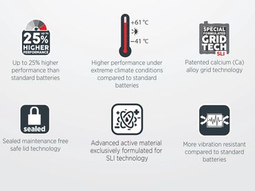 Castrol SLI Batteries are flooded type batteries featuring SLI Technology, which are suitable for use in cars of all classes and light commercial vehicles. They meet the starter need of the vehicle and supply necessary energy when the engine is not running.