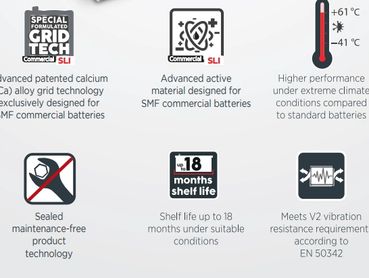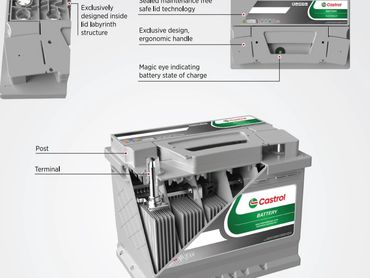 Castrol SLI Batteries are primarily used in European(DIN)/Japan(JIS) type of vehicles and deliver the power required for the engine to run. When the engine is not running, these batteries provide the power required by the onboard electrical equipment. Serving a broad range from pickup vehicles to minibuses, Castrol SLI Batteries are a reliable solutions partner that meets vehicle manufacturers' technical and superior performance expectations. Castrol SLI Batteries offer up to 25% higher performance than standard batteries. Equipped with the patented calcium (Ca) alloy grid technology,  SLI Batteries have a fully sealed cover system, which means they do not require maintenance. Castrol SLI Batteries offer better performance than standard batteries under harsh climate conditions, besides adapting to varying road conditions thanks to their high vibration resistance. Castrol SLI Batteries have a modern design that contains a unique labyrinth structure inside the cover, a fire-arresting filter, an ergonomic handle and an indicator that shows the battery charge level.